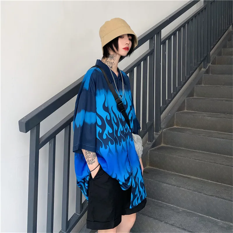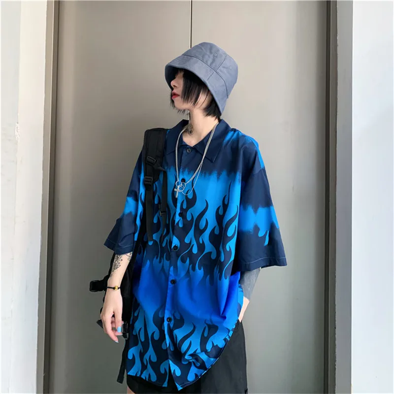 Buy Lychee Harajuku Loose Summer Tops for Women Casual Blue Flame Print Women Blouse Short Sleeve Crew