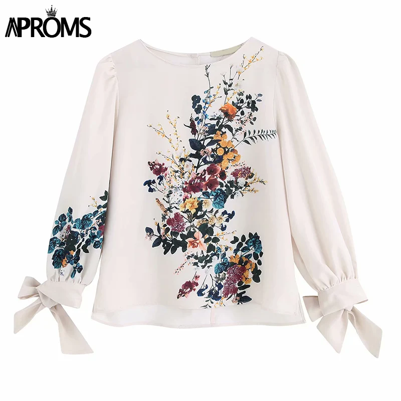 Promo Aproms Elegant Puff Sleeve Bow Tie Shirt Sweet Floral Print O-neck Women Blouse Ladies Chic Autumn