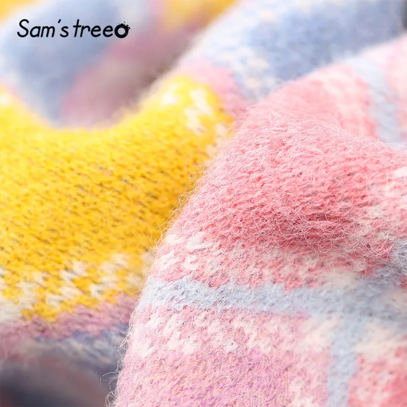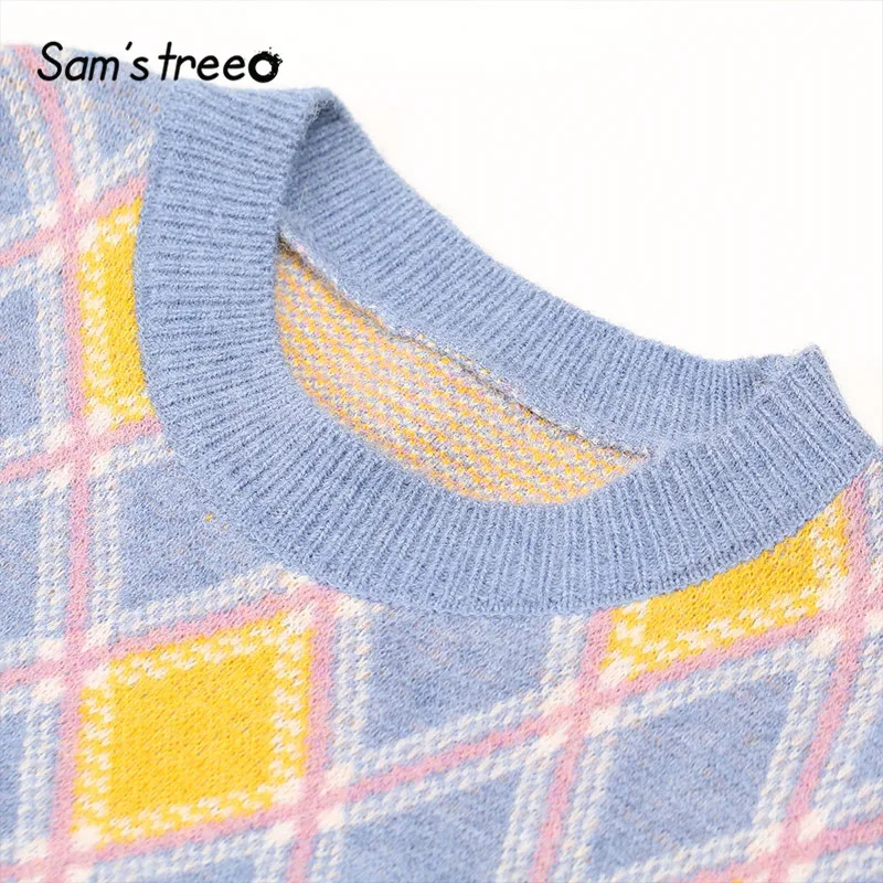 New SAM'S TREE Pink Argyle Colorblock Knit Pullover Casual Women Sweaters 2020 Winter Blue Lantern Slee