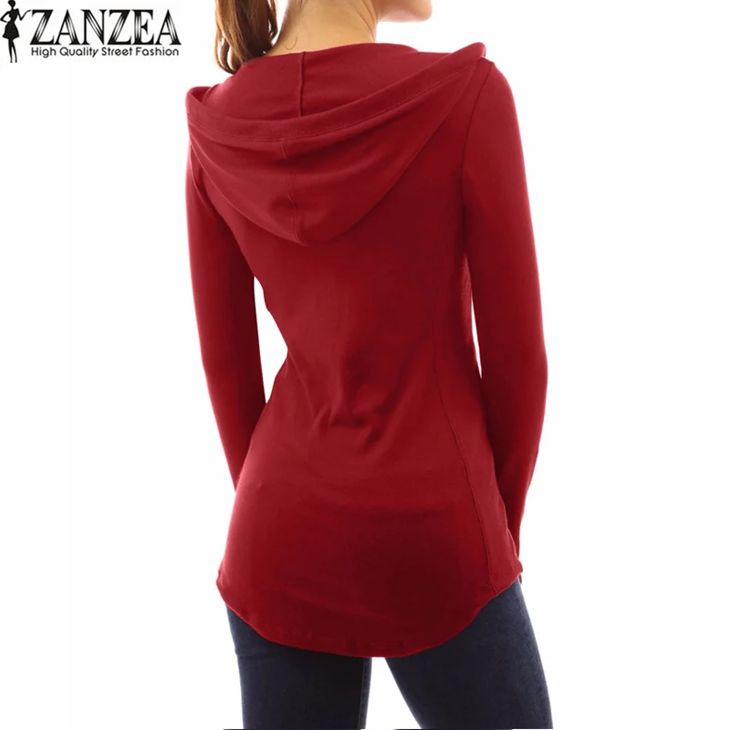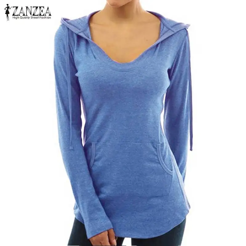 Promo ZANZEA Women Hoodies Long Sleeve Shirts Autumn Sweatshirts Casual Solid Hooded Tops Female Slim Blu