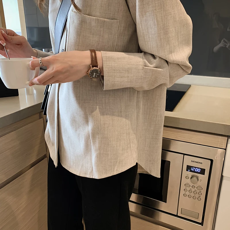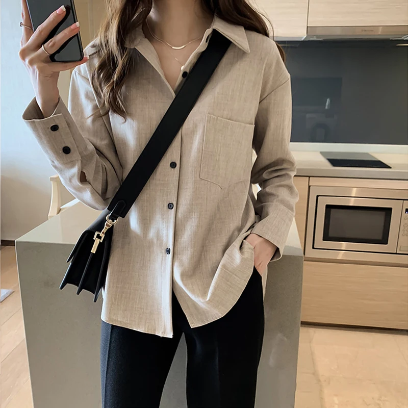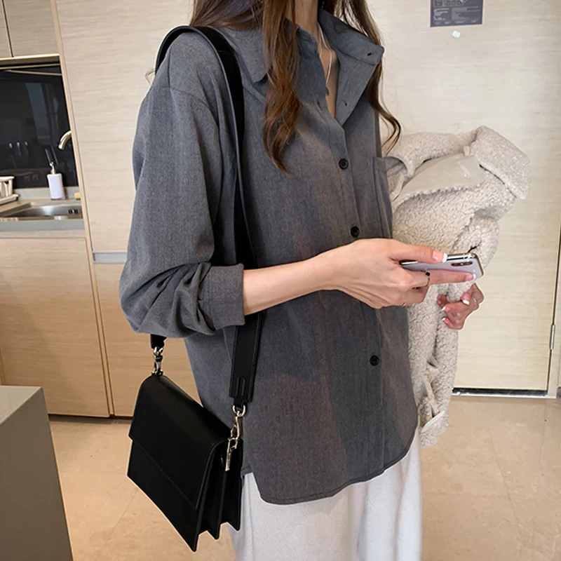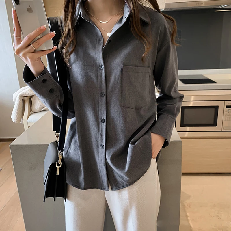 Promo New Arrival Women Solid Gray Blouse Batwing Long Sleeve Pockets Oversize Shirt Turn-Down Collar Top